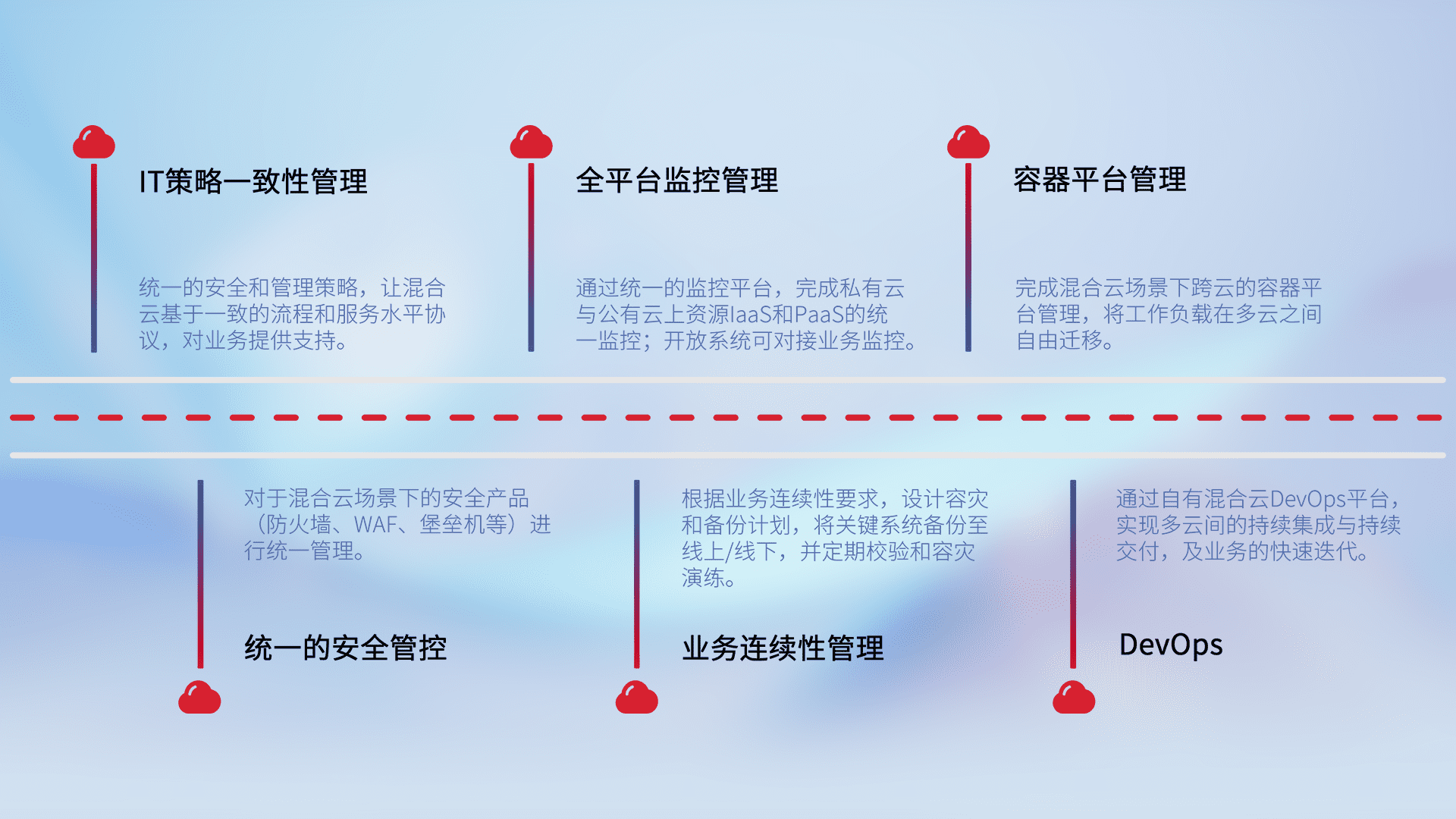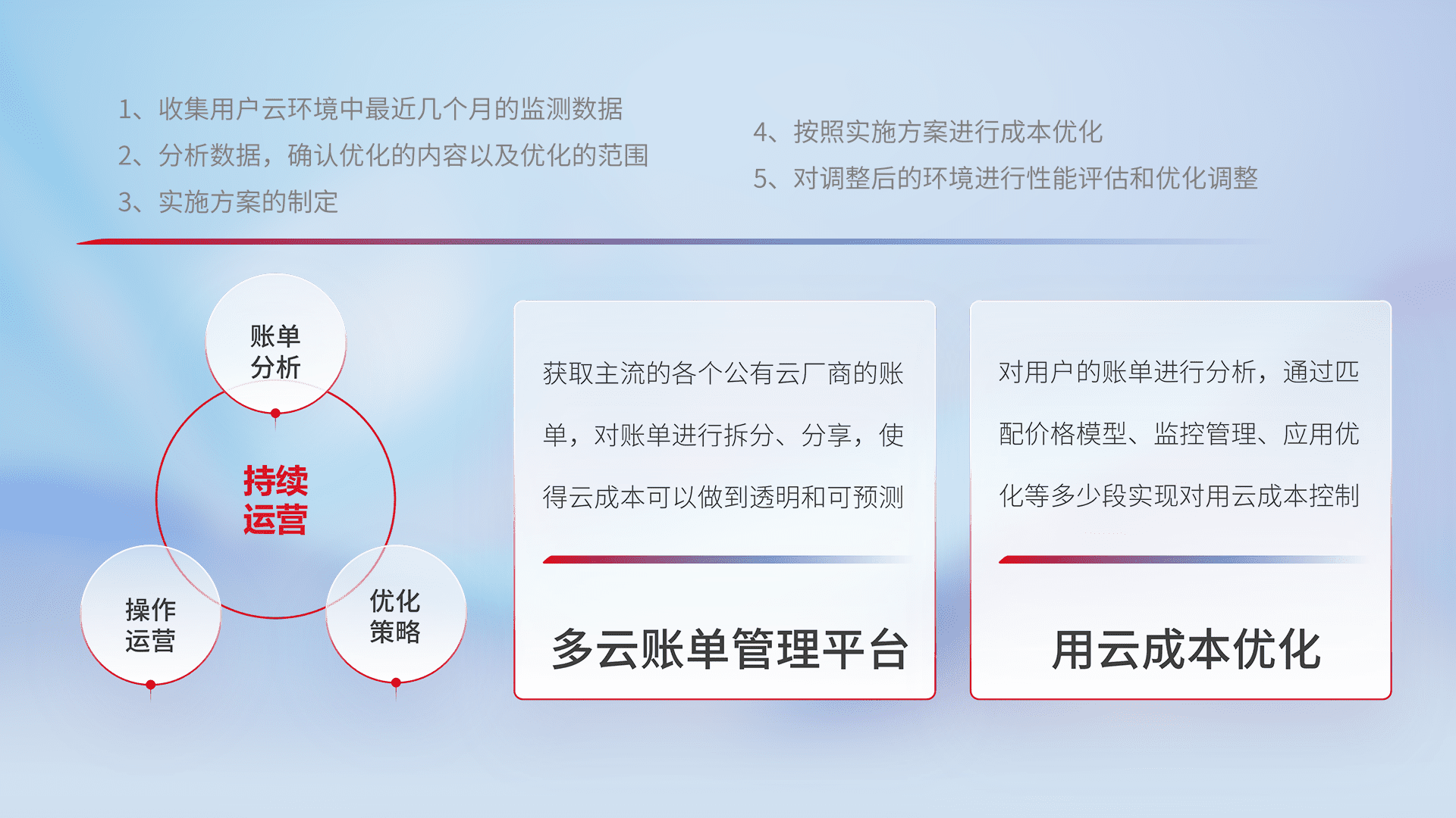 通过多云纳管,,,,以统一的资源数据模型把客户的云资源进行抽象和封装,,进而实现对多云资源的统一操作,,,保障云资源管理的可靠性、、稳定性与可用性。。。。量身定制化运维内容,,,,配置、、、、开发运维、、、、补丁管理、、备份、、、、监控、、、认证和访问管理、、、审计和日常巡检等,,保障在用云过程中的可靠度,,,稳定度以及高可用率。。。