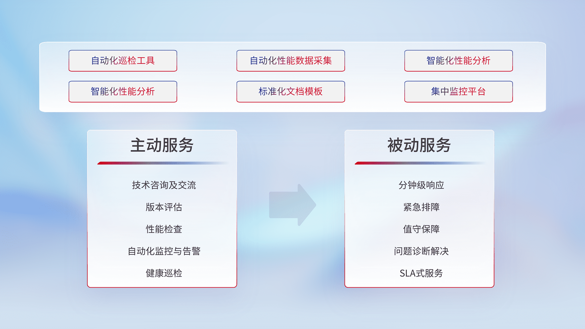 智能化工具和标准化文档,,,保障服务质量,,,,提供主动服务(包含技术咨询、、版本评估、、性能检查、、、自动化监控与告警、、健康巡检)和被动服务包含(分钟级响应、、、紧急排障、、、值守保障、、问题诊断解决、、SLA服务)。。。